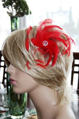 Last, but not least, in this set of red is a customized version of our Cady made in red, black and ivory as inspired by the multi-color gowns above. This Cady is made of dyed and bleached schlappen feathers with stripped coque. Inspired by the Dragonfly - a theme throughout the Foggy Bottom Ladies Boutique - this piece is accented at the base with a Dragonfly made of clear red and AB red Swarovski crystals.